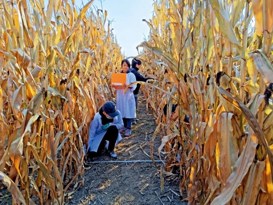 中科院沈陽應(yīng)用生態(tài)研究所張旭東研究員團(tuán)隊(duì)成員在保護(hù)性耕作研發(fā)基地測玉米產(chǎn)量。