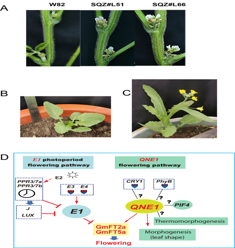 近日,中科院東北地理與農業生態研究所大豆分子設計育種實驗室夏正俊研究員團隊與中科院遺傳所田志喜研究員合作,成功克隆了一個調控大豆營養生長期長度的新型基因QNE1.該基因編碼TCP類轉錄因子,其作用方式與已有的光周期調控開花通路完全不同,豐富了大豆開花調控的調控機制。相關研究成果在線發表于《中國生命科學》。