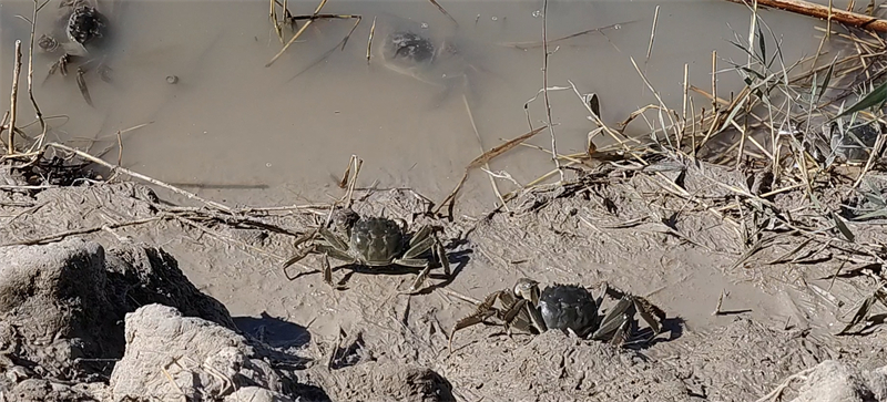 沿著木棧道再向前,膝蓋高的塑料膜布圍出一塊四方葦田,幾百只青黑色的螃蟹爬來爬去,這些螃蟹便是當地村民口中的“大蜘蛛”。