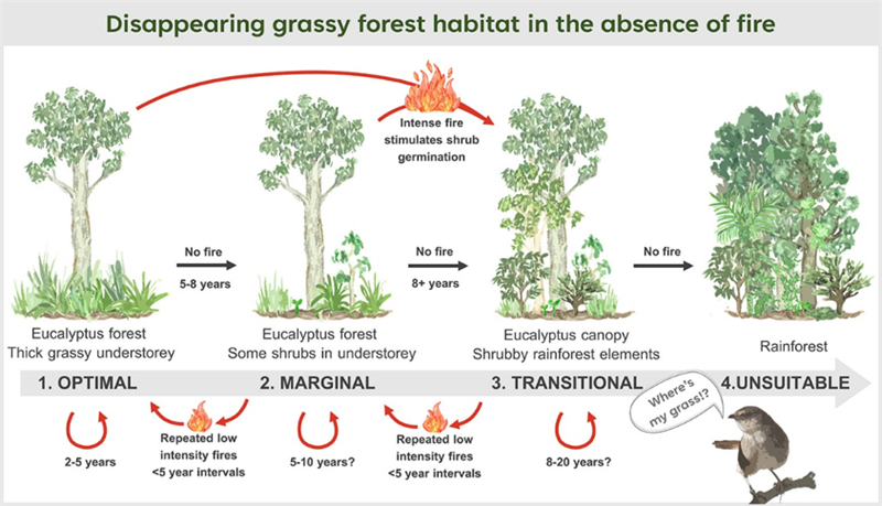 注:在火燒缺失2-5年時,草地-森林生境會保持一個和諧穩定的狀態;當火燒缺失5-8年時,生境中灌木的比例會逐漸增加;當火燒缺失8年以上時,草地所占的比例會進一步減少,直至完全消失。