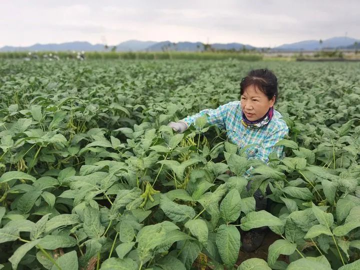 在黑龍江省齊齊哈爾市依安縣太東鄉,李艷華在田里查看豆株。受訪者供圖