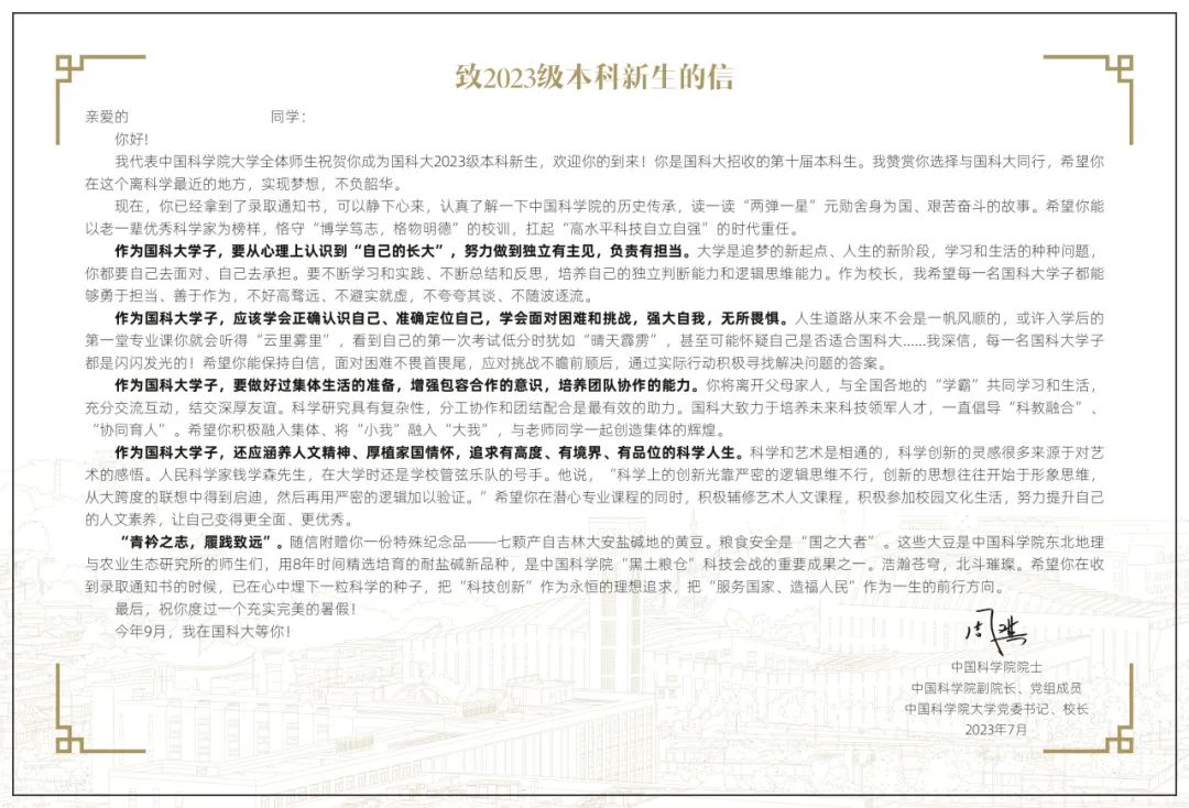 國科大2023年首封本科生錄取通知書送達(dá)!