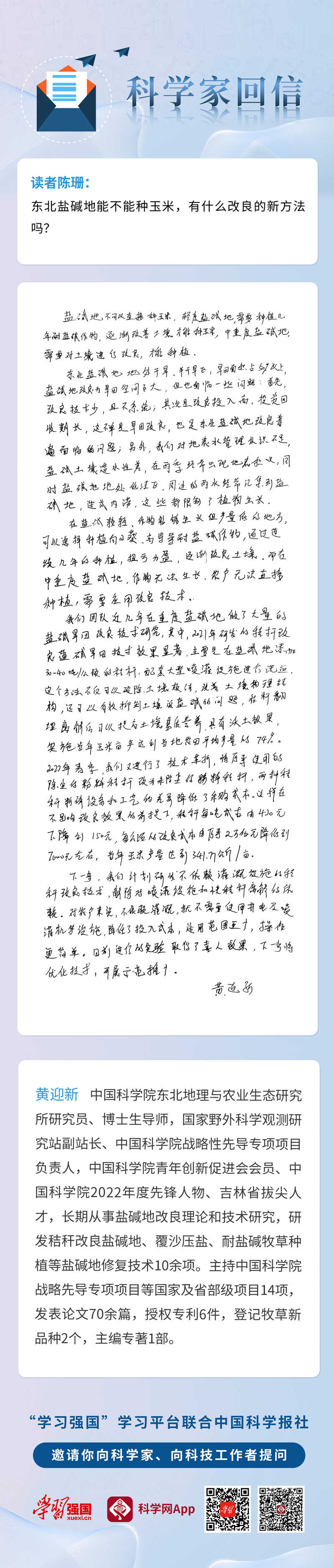 編者按:2023年5月起,“學(xué)習(xí)強(qiáng)國”學(xué)習(xí)平臺(tái)與中國科學(xué)報(bào)社聯(lián)合發(fā)起“科學(xué)家回信”活動(dòng),邀請(qǐng)廣大讀者向自己心中向往尊敬的科學(xué)家、科技工作者提問、留言。活動(dòng)啟動(dòng)后,“學(xué)習(xí)強(qiáng)國”“科學(xué)網(wǎng)App”收到了讀者的踴躍留言。我們精選了讀者陳珊的提問,請(qǐng)中國科學(xué)院東北地理與農(nóng)業(yè)生態(tài)研究所研究員、博士生導(dǎo)師黃迎新發(fā)出第四十一期回信。