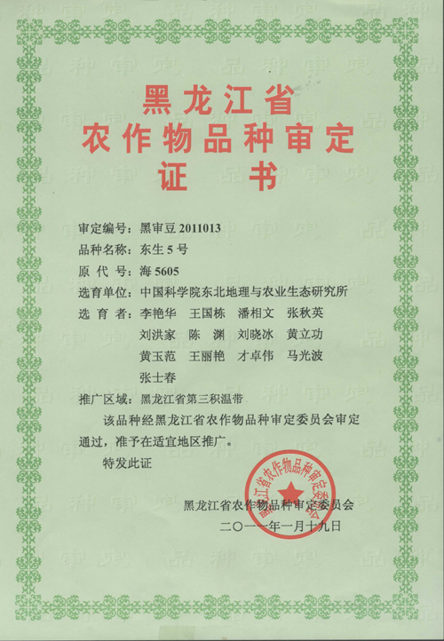 近日,我所研制的大豆新品種“東生5號”(品種審定編號:黑審豆2011013),經“黑龍江省農作物品種審定委員會”審定通過,準予在適宜地域推廣。