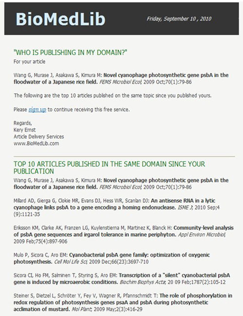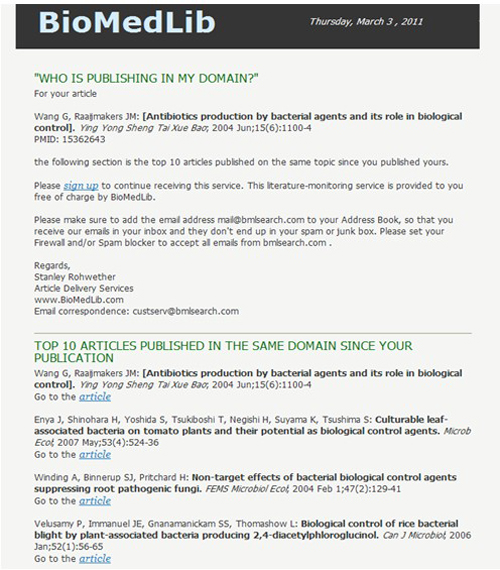 BioMedLib是生物醫(yī)學(xué)科技搜索引擎。在MEDLINE數(shù)據(jù)庫發(fā)表的上億篇生物醫(yī)學(xué)科技論文中,自動(dòng)評(píng)測(cè)出相關(guān)領(lǐng)域中發(fā)表的十大最佳論文(Top 10 Articles Published in the Same Domain Since Your Publication)。我所王光華研究員于2004年發(fā)表在《應(yīng)用生態(tài)學(xué)報(bào)》上論文“Antibiotics production by bacterial agents and its role in biological control”(2004, 15:1100-1104)和2009年發(fā)表在FEMS Microbiology Ecology上的論文“Novel cyanophage photosynthetic gene psbA in the floodwater of a Japanese rice field” (2009, 70:79-86)最近被評(píng)為同領(lǐng)域研究十大最佳論文。
