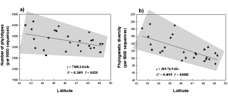 東北黑土是我國重要的土壤資源,在保障國家糧食安全和生態安全上具有重要地位。由于受氣候、開墾年限和農田管理措施等的影響,東北黑土農田土壤養分含量,特別是土壤有機質含量呈現規律性的地理分布,即總體呈現南低北高的趨勢。但對于黑土土壤微生物是否也存在著地理分布格局?如果存在,其驅動因素是什么?還不清楚。為此,東北地理與農業生態研究所農田分子生態學科組王光華研究員等人,于2012年從東北黑土帶上基于土壤有機質含量的差異,南起遼寧昌圖北至黑龍江訥河,采集了26個農田土壤樣品,采用454高通量測序技術成功地解析了東北黑土細菌群落結構的地理分布規律及其驅動因素。研究共獲得35萬多條細菌序列,包括至少35個細菌類群,其中酸桿菌門(Acidobacteria)、放線菌門(Actinobacteria)、變形菌門(Proteobacteria)、擬桿菌門(Bacteroidetes)、綠灣菌門(Chloroflexi)、芽單胞菌門(Gemmatimonadetes)和浮霉菌門(Planctomycetes)等7個菌門細菌為黑土農田優勢微生物(平均豐度>5%以上)。研究還發現綠灣菌門、芽單胞菌門和浮霉菌門細菌的相對豐度在黑土農田中較以往報道的其它土壤中高出5倍以上。本研究未發現普遍報道的現象,即土壤酸桿菌門豐度與土壤pH值具有顯著的相關性,但發現黑土農田中酸桿菌門中亞門1和3與土壤pH成顯著負相關,而亞門4、5、6、7和25則與土壤pH成顯著正相關關系。研究結果揭示出東北黑土農田細菌群落結構組成、多樣性及優勢細菌門的相對豐度受土壤pH和土壤有機質含量的雙重影響,且土壤pH的作用強度大于土壤有機質(圖1)。此外,地理距離也是影響黑土農田細菌群落結構的另一重要因素(圖2),黑土農田細菌群落結構組成存在明顯的地理分布格局,低緯度低有機質含量的黑土,雖然土壤微生物量小,但高緯度高有機質含量的黑土相比具有更高的土壤細菌多樣性(圖3)。