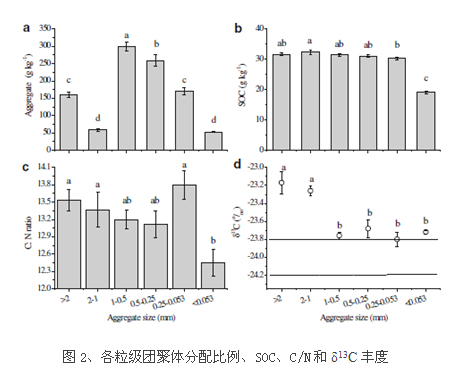 根際沉積碳是連接植物、土壤和微生物的紐帶,根際沉積碳作為根際微生態(tài)系統(tǒng)中的物質(zhì)流、能量流和信息流,具有十分重要的作用。根際沉積碳的空間分布直接調(diào)控著根際效應(yīng),同時(shí)受作物根系吸收水分和土壤團(tuán)聚過程的影響。目前,有關(guān)根際沉積碳在土壤孔隙、團(tuán)聚體中的分配及在根際中遷移還不清楚。為此,我所土壤物質(zhì)循環(huán)學(xué)科組喬云發(fā)副研究員等人,利用C3-C4轉(zhuǎn)換研究方法,在中國科學(xué)院海倫農(nóng)業(yè)生態(tài)實(shí)驗(yàn)站連作13年大豆C3土壤上種植C4作物玉米,采用田間13C-CO2脈沖標(biāo)記方法,應(yīng)用土壤當(dāng)量孔徑與土壤水吸力的關(guān)系,結(jié)合土壤水穩(wěn)性團(tuán)聚體;利用穩(wěn)定性同位素質(zhì)譜測定試驗(yàn)前后原土和各粒級水穩(wěn)性團(tuán)聚體SOC和δ13C豐度;利用壓力膜儀獲得不同土壤孔徑內(nèi)土壤水含量,接合同位素質(zhì)譜測定不同孔徑內(nèi)土壤水的δ13C豐度;利用原狀土柱方法模擬根際土壤,從而系統(tǒng)研究了玉米根際沉積碳在土壤孔隙、團(tuán)聚體和根際遷移機(jī)制。