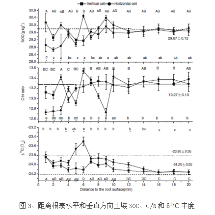 結(jié)果表明,土壤δ13C豐度由試驗(yàn)前?24.20±0.05‰增加為?23.80±0.05‰,并且不同粒級土壤團(tuán)聚體的δ13C豐度也有不同程度的增加。雖然>0.25 mm各粒級土壤團(tuán)聚體有機(jī)碳含量沒有明顯增加,但是,在>2 mm和1~2 mm粒級團(tuán)聚體中有明顯的δ13C (?23.17±0.12‰,?23.26±0.05‰) 富集信號。此外,根際沉積碳主要分布在2~20 μm土壤孔徑當(dāng)量內(nèi)。根際沉積碳的空間分布可以延伸到距根14 mm區(qū)域。水平方向在距根6 mm,垂直方向在距根5mm,出現(xiàn)根際沉積碳信號最大值。這些結(jié)果表明,根際沉積碳或其代謝產(chǎn)物被土壤團(tuán)聚體保護(hù),根際有明顯的遷移區(qū)域。在植物生長過程中,根際沉積調(diào)控土壤結(jié)構(gòu)形成和土壤有機(jī)質(zhì)的激發(fā),這些調(diào)控機(jī)制需要進(jìn)一步深入研究。
