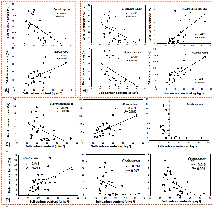 圖2 黑土農(nóng)田真菌在門(mén)(A)、綱(B)、目(C)和屬(D)上的相對(duì)豐度與土壤全碳含量間的關(guān)系