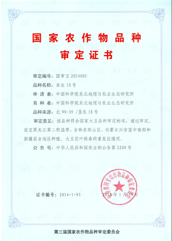 我所培育出的大豆品種“東生10號”獲得農業部國家農作物品種審委員會頒發的國家農作物品種審定證書,這是我所培育的大豆東生系列品種第四個獲得國家農作物品種審定證書,審定編號:國審豆2014005。公告號:中華人民共和國農業部公告第2209號,證書編號:2014-1-93。
