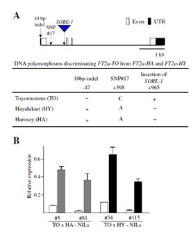大豆光周期和成熟期的研究對于大豆適應不同緯度以及大豆產量的提高具有重要意義。雖然目前已經克隆的E1、E2、E3和E4基因的變異對大豆適應不同光周期環(huán)境起著關鍵性的作用。但是,對于開花期和成熟期自然變異的分子機理研究較少。利用早熟品種構建的雜交群體,我們檢測到兩個控制開花期的主要位點:E1和E9。由于E1已經被克隆,因此本研究以E9為切入點,結合精細定位、測序和表達分析技術,明確E9基因就是FT2a基因。無論是何種光周期條件,e9的轉錄表達水平始終低于E9,從而延遲開花期。此外,測序結果表明,E9和e9的編碼序列相同,但在啟動子、非編碼區(qū)以及內含子區(qū)域有一系列的單堿基置換、片段插入和片段缺失的變化。其中,e9在第一個內含子中含有一個Ty1/copia類似的反轉錄轉座子SORE-1,高度甲基化的SORE-1雖然不會影響FT2a的RNA加工過程,但是SORE-1作為轉錄抑制因子,其插入會降低GmFT2a的表達水平。