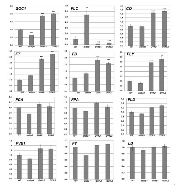 圖2. 開花途徑節點基因在AtDBP1過表達植株與敲除的突變體中的表達分析
