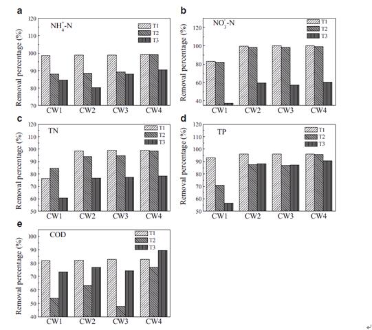 圖1栽種不同植物的水平潛流人工濕地在不同環境溫度下的凈化效果(CW1:無植物對照; CW2:美人蕉;CW3:千屈菜;CW4:美人蕉與千屈菜混種)