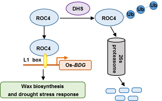 進(jìn)一步研究發(fā)現(xiàn),DHS具有E3泛素連接酶活性,能夠與HD-ZIP Ⅳ家族轉(zhuǎn)錄因子ROC4相互作用,分析ROC4過(guò)量表達(dá)植株和基因敲除突變體,發(fā)現(xiàn)ROC4正調(diào)控水稻表皮蠟質(zhì)合成和干旱脅迫反應(yīng);ROC4體內(nèi)蛋白具有泛素化形式,并受泛素/26蛋白酶體(UPS)途徑介導(dǎo)降解;DHS促進(jìn)ROC4降解,而dhs突變減緩ROC4降解;遺傳學(xué)分析表明,ROC4作用于DHS下游;DHS-ROC4直接調(diào)控下游靶基因Os-BDG的表達(dá)。