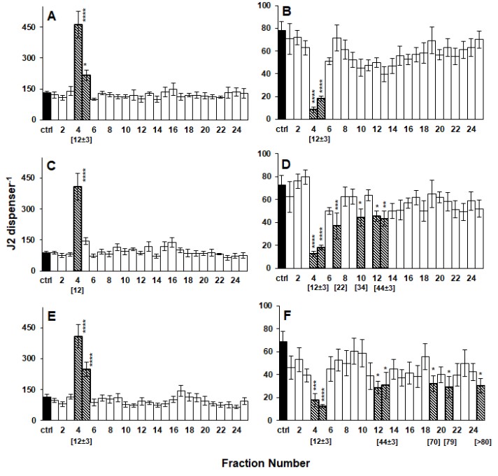 圖3線蟲對植物根滲出物RP-HPLC分離組分的趨化性;辣椒(AB)、大豆(CD)和萬壽菊(EF)