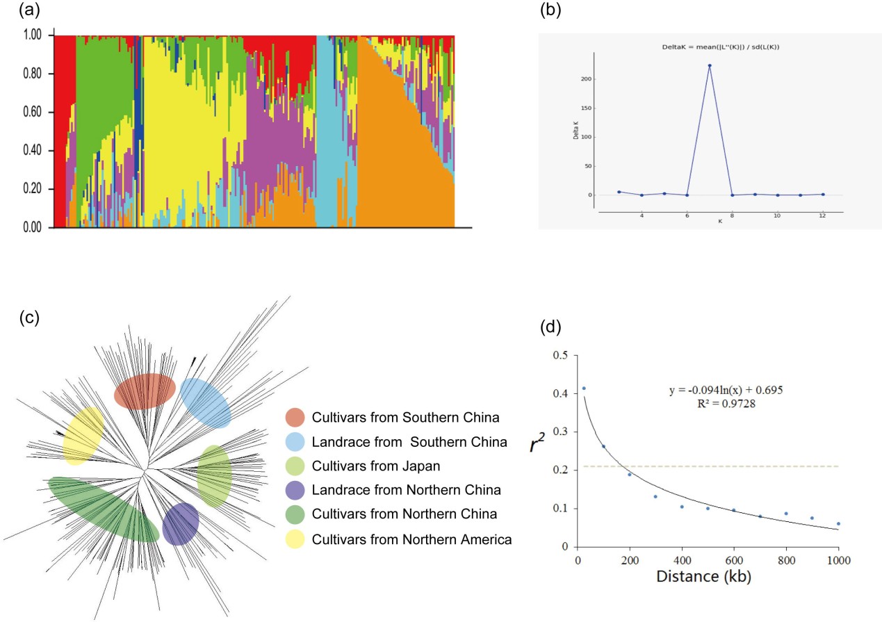 東北地理所大豆分子育種學(xué)科組利用IlluminaSoySNP8k iSelectBeadChip(中等密度芯片)對(duì)來(lái)自中國(guó)、日本、美國(guó)、加拿大和其他國(guó)家的235份大豆資源進(jìn)行基因型分型,獲得了4471個(gè)多態(tài)性SNP分子標(biāo)記,揭示了一個(gè)相對(duì)復(fù)雜的群體結(jié)構(gòu)并將該群體分為7個(gè)亞群體,與品種的地理起源相對(duì)應(yīng)。通過(guò)GWAS分析,共鑒定了30個(gè)與生育期相關(guān)的QTNs(Quantitative trait nucleotides)位點(diǎn),16個(gè)種子蛋白及油分含量相關(guān)的QTNs位點(diǎn)。其中大部分QTNs與SoyBase (soybase.org)中報(bào)道的已知相關(guān)性狀的QTL一致,證明了在遺傳研究及分子育種中,中等密度SNP芯片在基因分型上的重要作用,有助于有關(guān)生育期及種子蛋白和油分含量QTL鑒定及基因克隆,對(duì)農(nóng)業(yè)生產(chǎn)具有重要的指導(dǎo)意義。