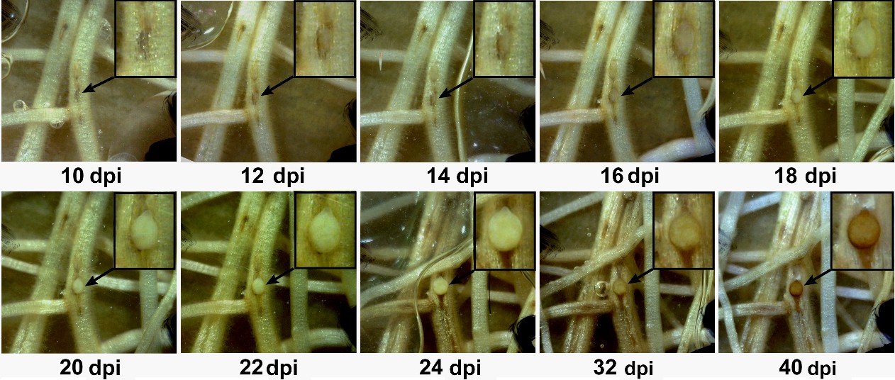 圖1 在幼苗生長袋中直接觀察大豆孢囊線蟲侵染大豆根部后的發(fā)育過程。(箭頭所指是同一個線蟲)