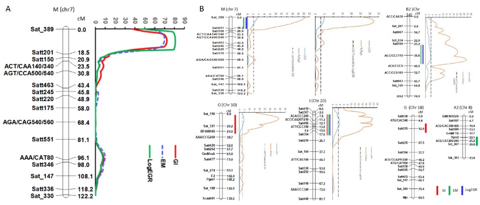 圖2.調(diào)控北方根結線蟲(A)和南方根結線蟲(B)的蟲癭指數(shù)(GI)、卵塊數(shù)(EM)和卵數(shù)量(LogEGR)的大豆主效基因的分布及調(diào)控