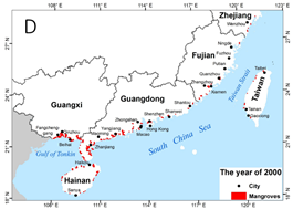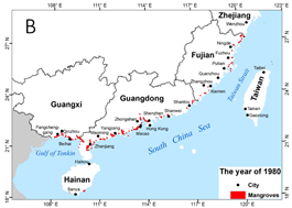 紅樹林是生長在熱帶、亞熱帶海岸潮間帶或河流入??诘哪颈局参锶郝?,具有防風消浪、保護灘涂、凈化海水和促淤造陸等重要作用,是國際上濕地生態保育和生物多樣性保護的重要對象。然而近半個世紀以來,人類活動和自然環境的變化導致紅樹林資源急劇減少,全球35%的紅樹林在此期間消失。紅樹林不可取代的生態、經濟、社會效益,以及面臨著自然和人為雙重脅迫下急劇銳減的嚴峻形勢,使得紅樹林保護和管理越來越受到世界各國的重視。在中國,上世紀后50年紅樹林遭到嚴重破壞,其損失速率顯著高于世界平均水平。自20世紀90年代中期開始,中國政府頒布了一系列紅樹林保護的法律和條例,但是關于紅樹林保護成效的研究甚少。特別是在國家尺度上,紅樹林保護的成效如何?各個保護區的建立是否起到了保護當地紅樹林的作用?等等相關問題還沒有明確的答案。這些問題的解答對于制定合理的濱海濕地保護、恢復和資源利用政策意義重大,對于建設“美麗中國”這一生態文明目標的相關工作也具有重要的借鑒意義。