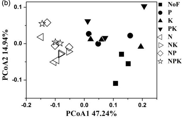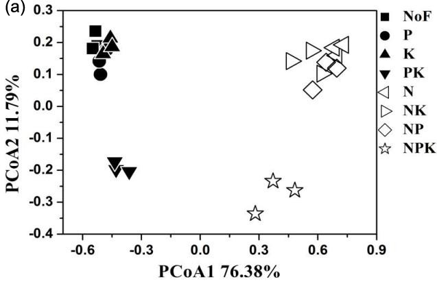 圖1不同化肥處理對農田黑土細菌群落(a)和固氮菌群落(b)結構影響的PCoA分析