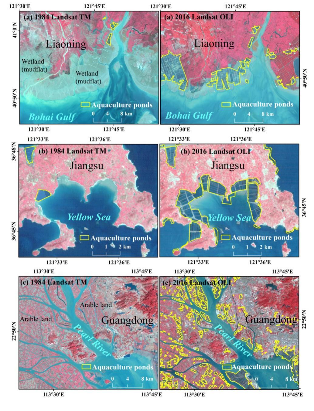 研究發(fā)現(xiàn),截止到2016年,中國濱海養(yǎng)殖池塘擴張面積達10,463 km2 ,約為80年代初期面積的4倍,其中,廣東、山東、江蘇是濱海養(yǎng)殖池塘擴張的熱點地區(qū)。近32年來,大部分沿海省市養(yǎng)殖池塘均呈持續(xù)增加的趨勢,1990-2000年間擴張最為劇烈,且主要發(fā)生在海岸線向陸一側的10公里緩沖帶范圍內。養(yǎng)殖池塘擴張的主要土地覆被來源是濱海濕地(包括灘涂、紅樹林、蘆葦沼澤等)和耕地類型。政府導向的濱海土地開發(fā)政策、改革開放帶來的經濟飛速發(fā)展等是造成濱海養(yǎng)殖池塘快速擴張的主要驅動因素,而濱海天然濕地損失、水質惡化等則是養(yǎng)殖池塘擴張最直接和主要的環(huán)境影響。