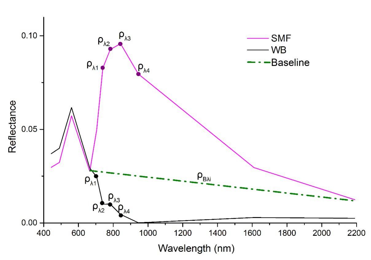 MFI =[〖(ρ〗_λ1-ρ_(Bλ1)+) 〖(ρ〗_λ2-ρ_(Bλ2)+) 〖(ρ〗_λ3-ρ_(Bλ3)+) 〖(ρ〗_λ4-ρ_Bλ4)]/4 (1)
