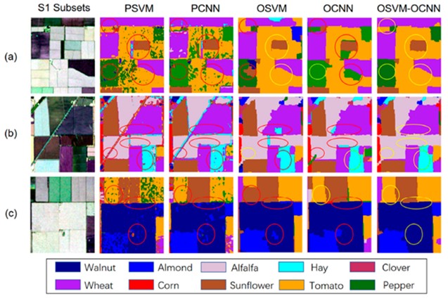 圖 2 OSVM-OCNN及幾種基準算法生產的土地覆被分類圖