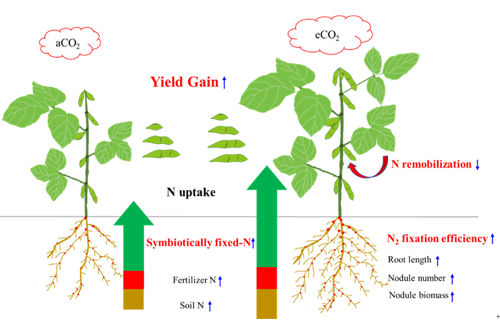 大氣CO2濃度不斷升高是全球氣候變化的重要環(huán)境因子,根據(jù)計算大氣CO2濃度已從工業(yè)革命前的270 ppm升高到目前的412 ppm(http://scrippsco2.ucsd.edu/#),預(yù)測到本世紀(jì)中葉大氣CO2濃度將升高到550 ppm,本世紀(jì)末達(dá)到700 ppm。研究發(fā)現(xiàn)大氣CO2濃度升高促進(jìn)C3作物生物量提高,即肥料效應(yīng)(CO2fertilization effect),但會導(dǎo)致植株氮(N)濃度降低,進(jìn)而抑制產(chǎn)量的持續(xù)增加。大豆是對CO2濃度升高響應(yīng)最敏感的作物之一,由于其本身具有共生生物固氮能力,理論上大氣CO2濃度升高可能顯著改變N吸收模式,進(jìn)而影響CO2肥料效應(yīng)。