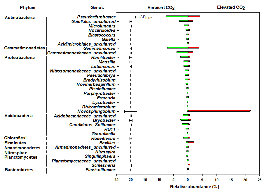 圖1進(jìn)行13CO2標(biāo)記的大豆根際土壤13C-DNA組分中屬水平細(xì)菌的相對(duì)豐度。此圖中僅展示對(duì)不同CO2濃度處理有顯著(p< 0.05)響應(yīng)的屬。
