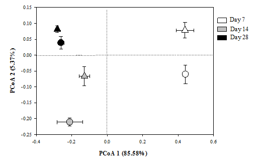 圖2正常CO2濃度(○)和CO2濃度升高(△)條件下大豆殘?bào)w在培養(yǎng)7天、14天、28天后土壤整體細(xì)菌群落結(jié)構(gòu)PCoA圖。