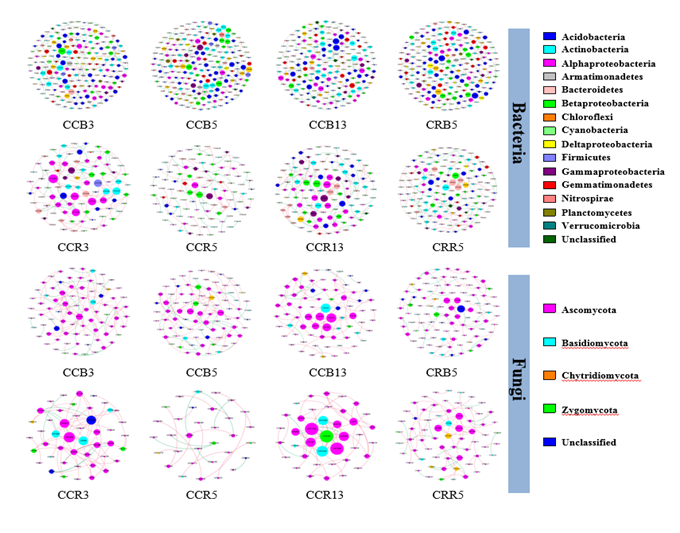 東北地理所農田分子生態學科組基于大豆短期連作(3年和5年)、長期連作(13年)及大豆-玉米輪作等處理,采用高通量測序技術系統研究了東北區大豆連作障礙發生的微生物機制。研究發現,與短期連作相比,長期連作和輪作處理顯著增加了土壤養分含量、細菌和真菌多樣性指數而降低了土壤真菌與細菌數量的比值。發現土壤pH和C:N分別是驅動大豆連作下土壤細菌和真菌群落發生演替的主要影響因素。長期連作和輪作處理顯著增加了有益細菌Bradyrhizobiumsp和Gemmatimonassp的相對豐度,而顯著降低了病原真菌Fusariumsp的相對豐度(圖1)。此外,與短期連作相比,長期連作和輪作處理增強了細菌和真菌群落的網絡結構與穩定性。輪作處理中具有分解木質素和纖維素等有益細菌Bryobacter、Gemmatimonas和Terracidiphilus與真菌群落中具有抑制病原微生物生長的Trichoderma、Mortierella和Exophiala作為主要的關鍵微生物類群(Module hubs和Connectors),可能對改善土壤環境具有積極的作用(圖2)。總體而言,大豆長期連作處理在微生物數量、多樣性指數及群落結構組成與短期連作處理差異顯著,但與輪作處理相似,說明大豆長期連作導致了土壤產生“抑病土”的微生物基礎。