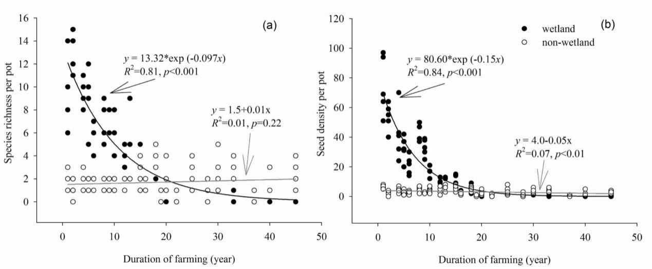 在沼澤濕地生態恢復理論研究方面,系統揭示了沼澤濕地土壤種子庫的結構和規模特征,發現沼澤濕地土壤種子庫具有非常高的物種多樣性(>50種物種),在生態恢復中具有十分重要的作用。明確了水深和開墾年限是影響土壤種子庫的關鍵限制性環境因素(Wang et al., 2015)。發現沼澤濕地開墾后,隨著開墾年限的增加,土壤種子庫結構和規模發生變化,濕地物種豐富度及種子密度呈現指數函數快速下降趨勢,而非濕地物種維持在一個穩定的低水平。首次提出基于種源限制的沼澤濕地植被恢復的開墾年限閾值(15-20年),并結合植物功能群(莎草、禾草、非禾草、灌木)變化對退耕地植被自然恢復潛力進行“高—中—低”三級劃分,為退化沼澤濕地植被恢復技術優化和物種選擇提供科學依據(Wang et al., 2017)。目前該成果已被國內外多家著名的濕地生態恢復科研團隊采用,作為制定流域尺度濕地生態恢復方案的關鍵參數。