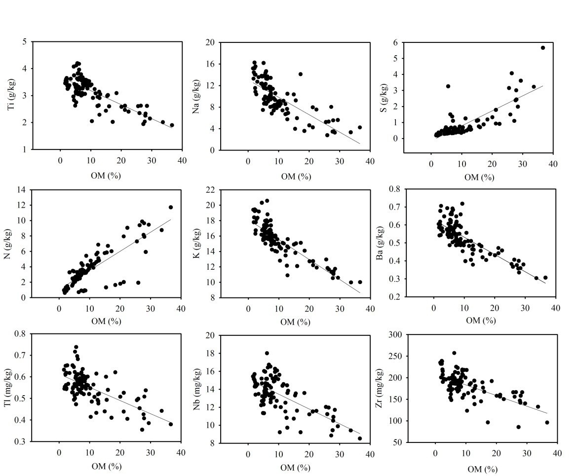 圖2 土壤元素含量與土壤有機質含量的相關性