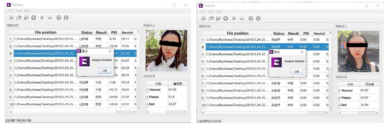 圖1. 利用計算機深度學習技術分識別分析志愿者在城市森林(左圖)和附近街區(右圖)中表情值的過程界面。