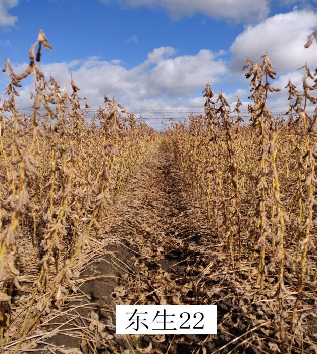 “東生22 ”為高蛋白、高產(chǎn)量品種。 “東生22 ”三年平均品質(zhì)分析結(jié)果蛋白質(zhì)含量43.80 %,脂肪含量 19.55 %;生產(chǎn)試驗平均公頃產(chǎn)量 2605.2公斤,較對照品種北豆40增產(chǎn)7.9%。中抗灰斑病。“東生22 ”為亞有限結(jié)莢習性。株高85厘米左右,無分枝,白花,長葉,灰色茸毛,莢彎鐮形,成熟時呈灰褐色。籽粒圓形,種皮黃色,種臍黃色,有光澤,百粒重20.0克左右。適宜在黑龍江省第三積溫帶西部區(qū)≥10℃活動積溫2350℃區(qū)域種植。