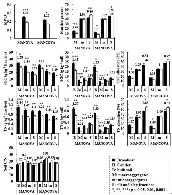 圖2. 闊葉林-針葉林土壤組分團聚特性、有機碳以及總氮的差異