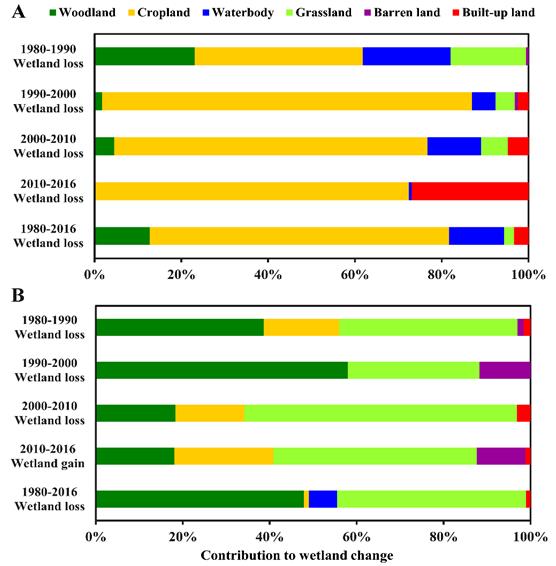 圖 不同時期黑龍江流域中俄濕地凈面積變化直接驅動因素貢獻量