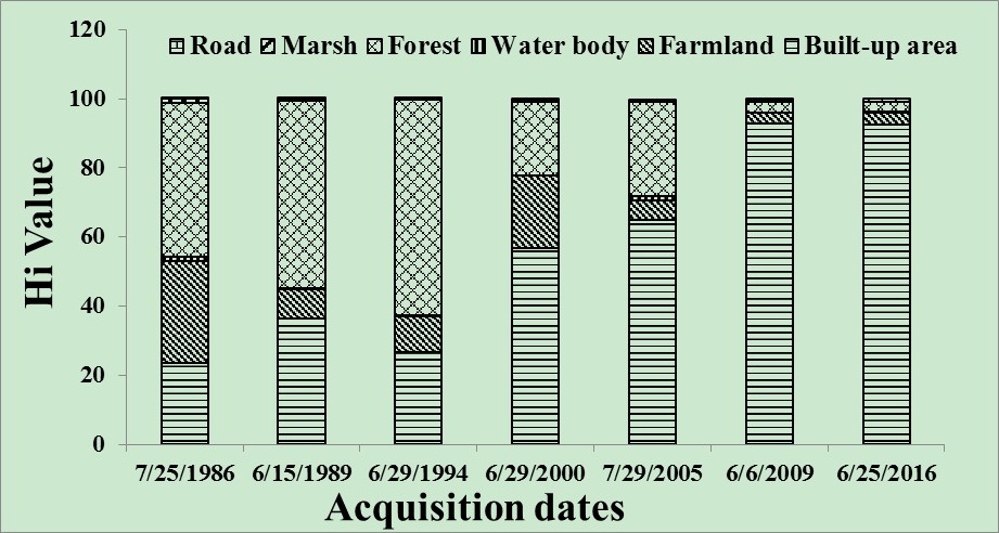 近些年來經濟不斷發(fā)展、城市持續(xù)擴張,使得城市熱島效應不斷增強,福州市已經連續(xù)多年成為中國新的“四大火爐”城市之一。根據氣象記錄,福州市連續(xù)日最高溫超過35℃的天數(shù)從2003年的24天增加到2013年的33天。城市熱島已經成為影響構建健康、舒適、宜居及可持續(xù)的福州市人居環(huán)境的重要因素。目前城市熱島相關研究很多,例如,濕地的冷島作用對城市熱島具有一定的緩解效果,但對于城市擴張導致濕地喪失對城市熱島效應時空分布的影響尚待分析。東北地理所水環(huán)境遙感團隊利用Landsat系列衛(wèi)星影像數(shù)據和單窗算法反演了福州市地表溫度,分析了1986-2016年城市熱島強度指數(shù)與景觀格局演變的關系,研究福州市城市熱島的發(fā)展規(guī)律和驅動機制,并重點討論了濕地對其他不同地表類型的降溫效果和40年來濕地降溫面積變化趨勢。研究發(fā)現(xiàn),建設用地對城市熱島效應的貢獻率從1986年的24%增加到2016年93%,而城市熱島強度增加主要原因是城市建設用地的擴張。研究利用GIS緩沖區(qū)分析方法統(tǒng)計了不同土地利用類型受到濕地影響距離和面積,發(fā)現(xiàn)1985至2015年的毗鄰區(qū)域受到濕地影響范圍呈現(xiàn)在波動中降低的趨勢,影響范圍下降平均速度為4.7km2/年。濕地喪失所導致濕地冷島效應的減弱,進一步促進了福州市熱島效應增強,而濕地面積減少的主要原因正是濕地轉化為建筑用地。研究結果可為城市規(guī)劃、城市建設及提升人居環(huán)境質量等提供理論依據與決策支持。