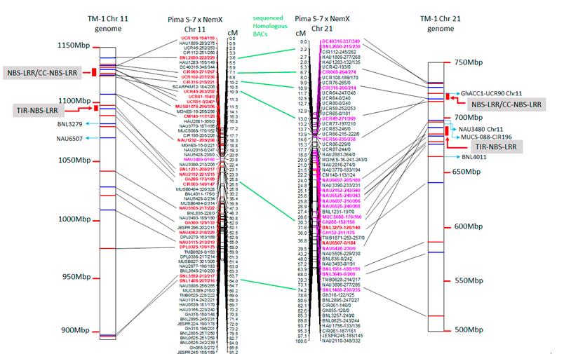 圖1:棉花TM1物理圖譜和RIL(PimaS-7xNemX)群體形成的遺傳圖譜比對。紅色的SSR分子標(biāo)記表示被定位到TM1-Chr11,粉色的SSR表示被定位到TM1-Chr21。