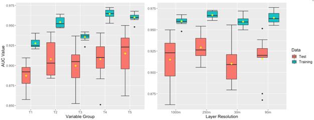 圖1 不同環境因子組合(T1:氣候因子;T2:氣候+土壤因子;T3:氣候+地形水文因子;T4:全因子;T5:去除因子共線性)和空間分辨率下的模型表現