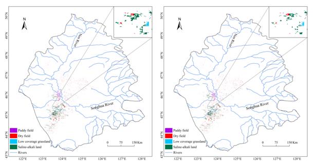 圖2 RCP 4.5 和RCP 8.5情景下松嫩平原濕地優先恢復區及其當前土地利用類型