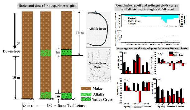 東北黑土區(qū)是中國重要的糧食核心產(chǎn)區(qū)和最大的商品糧生產(chǎn)基地,由于坡地被大量墾殖,水土流失逐年加劇,造成了嚴(yán)重的農(nóng)業(yè)面源污染。目前采用的最佳管理措施(BMPs),如壟作區(qū)田、地埂、魚鱗坑等,多以水土保持為目標(biāo)進(jìn)行設(shè)計,對于污染的削減主要通過大量攔截泥沙、徑流來實現(xiàn)。這些措施可能造成上游來水銳減,影響下游河流和湖庫的水生態(tài)質(zhì)量,尤其是在水源地流域,入庫徑流的減少可能造成水質(zhì)進(jìn)一步惡化、供水保證率降低,給下游居民的生產(chǎn)、生活用水帶來困難。為此,東北地理所水環(huán)境污染與防治學(xué)科組科研人員研發(fā)了新型等高植物草籬技術(shù),并利用在吉林省遼源市東遼縣杏木國家級水土保持示范園區(qū)內(nèi)的標(biāo)準(zhǔn)小區(qū),開展了草籬污染物削減能力實地監(jiān)測與模型模擬驗證工作。