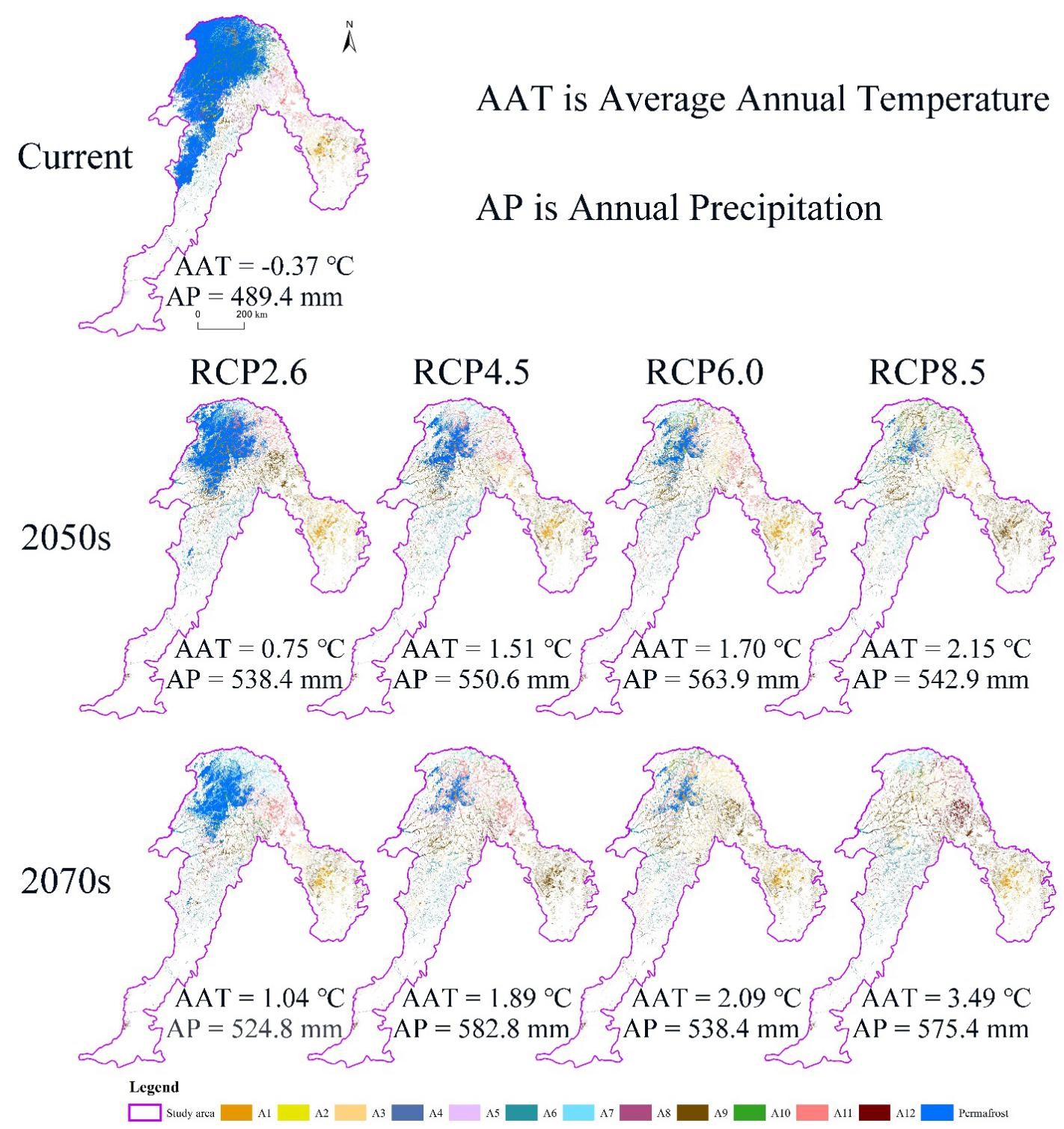圖1 氣候變化情景下大、小興安嶺地區濕地植物群落和凍土的空間分布