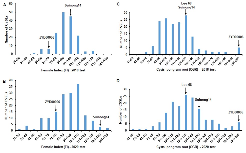 大豆孢囊線蟲病是制約大豆生產(chǎn)的全球性病害之一。大豆孢囊線蟲的抗性是由多基因和數(shù)量性狀控制。大多數(shù)研究是基于高抗和高感品種雜交形成的遺傳分離群體,存在高抗基因時,微效基因時常被掩蓋而不能被有效檢測到,然而后代對線蟲的表型反應(yīng)相對于親本顯現(xiàn)為廣泛的變異。此外,當前對大豆孢囊線蟲的抗性評價是建立在每株孢囊數(shù)與已知感病品種比較所得的雌蟲指數(shù),然而在研究中發(fā)現(xiàn)由于根重大小不一樣,特別是野生品種,僅局限于每株孢囊數(shù)的抗性評價對于育種有一定的局限性。農(nóng)田有害生物控制學科組王從麗研究員團隊和東北農(nóng)業(yè)大學陳慶山教授團隊合作首次利用大豆染色體代換系(CSSLs)群體展開了對大豆孢囊線蟲超親遺傳抗性的研究。