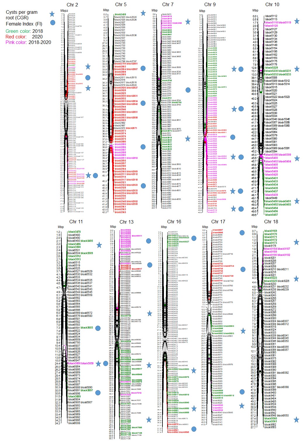 CSSLs是通過供體親本多次反復與輪回親本回交,然后經(jīng)基因組標記輔助選擇后自交獲得的群體,染色體片段的代換能夠通過表型的檢測準確的定位與性狀是否相關(guān)。因此,通過表型篩選CSSLs可以有效地識別并鑒定微效或主效QTLs。該研究所用CSSLs群體是利用野生大豆ZYD00006為供體親本,黑龍江省當?shù)氐闹髟云贩N綏農(nóng)14為回交親本的背景,這是我國東北目前唯一一個大豆代換系群體,同時這兩個親本的根重差異比較大,所以是用來評價每克根重孢囊數(shù)的理想群體。該研究通過對162個代換系群體進行表型篩選和高通量測序,首次報道了大豆孢囊線蟲每克根孢囊數(shù)(CGR)的QTL定位,也是首次利用CSSLs來評估大豆孢囊線蟲雌蟲指數(shù)FI和CGR的報道。表型鑒定發(fā)現(xiàn)代換系的FI和CGR分布范圍很廣,有超親后代(圖1);FI和CGR的相關(guān)性非常低,CGR和根重的相關(guān)性明顯高于FI和根重的關(guān)系。利用單因素標記Kruskal-Wallis(K*)分析(P<0.005)及多因子MQM定位方法(LOD>2),總共得到了38個QTLs(圖2),其分布覆蓋了大豆的20條染色體,這些QTLs具有很強的加性效應(yīng),解釋了SCN5.6-15.5%的FI表型貢獻率,6.1-36.2%的CGR表型貢獻率。其中有25個QTLs抗性來自于ZYD00006,13個QTLs來自于綏農(nóng)14,表明感病的雙親對于超親遺傳都有貢獻,同時間接解釋了SCN抗性的復雜性及其與目前已經(jīng)報道分布于所有染色體數(shù)量多于300個QTLs的原因。研究發(fā)現(xiàn)在缺少SCN主要抗性基因(如rhg1和Rhg4)的情況下,綜合考慮FI、CGR及根重三者有利基因的組合可以有效抑制線蟲繁殖,這對高效育種具有重要的指導意義。同時發(fā)現(xiàn)對SCN有耐性并適合于東北種植的具有綏農(nóng)背景的代換系株系具有潛在的應(yīng)用價值。