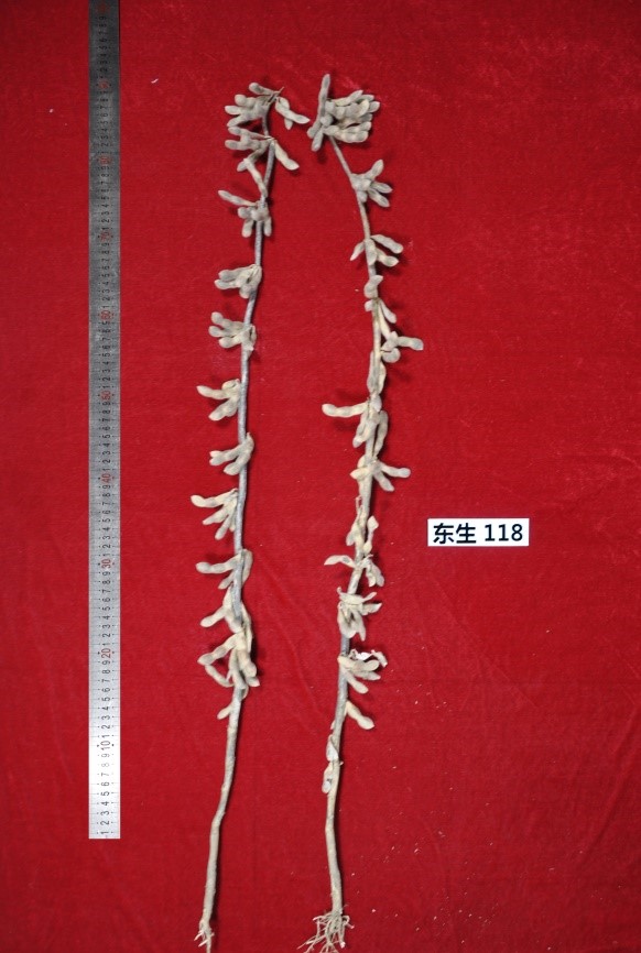“東生118” (審定編號:吉審豆20210028)為高產、高油大豆新品種。該品種以吉育79為父本,黑河43為母本。2019-2020年區域試驗平均公頃產量2977.4公斤,比對照吉育86增產7.1%;2020年生產試驗平均公頃產量2980.1公斤,比對照吉育86增產4.6%。“東生118”品種亞有限結莢習性,平均株高93.5厘米,主莖型結莢,主莖節數16.9個,以三粒莢為主,莢熟時呈深褐色。圓葉、白花、灰毛,籽粒圓形,種皮黃色,無光,種臍黃色,平均百粒重22.6克。人工接種鑒定,高抗大豆花葉病毒1號株系,抗大豆花葉病毒3號株系。兩年平均籽粒粗蛋白質含量38.53%,粗脂肪含量22.59%。
