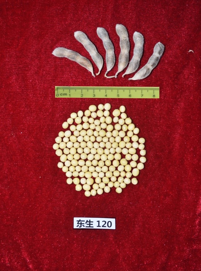 “東生120” (審定編號:吉審豆20210032)為高產、高油大豆新品種。該品種以吉大豆2號為父本,黑農48號為母本。2019-2020年區域試驗平均公頃產量2975.8公斤,比對照品種吉育86增產7.1%;2020年生產試驗平均公頃產量2947.3公斤,比對照吉育86增產3.8%。2019-2020年區域試驗平均公頃產量2975.8公斤,比對照品種吉育86增產7.1%;2020年生產試驗平均公頃產量2947.3公斤,比對照吉育86增產3.8%。亞有限結莢習性,平均株高88.9厘米,主莖型結莢,主莖節數16.4個,以三粒莢為主,莢熟時呈深褐色。圓葉、白花、灰毛,籽粒圓形,種皮黃色,有光澤,種臍黃色,平均百粒重18.5克。人工接種鑒定,高抗大豆花葉病毒1號株系,高抗大豆花葉病毒3號株系。兩年平均籽粒粗蛋白質含量37.78%,粗脂肪含量22.10%。