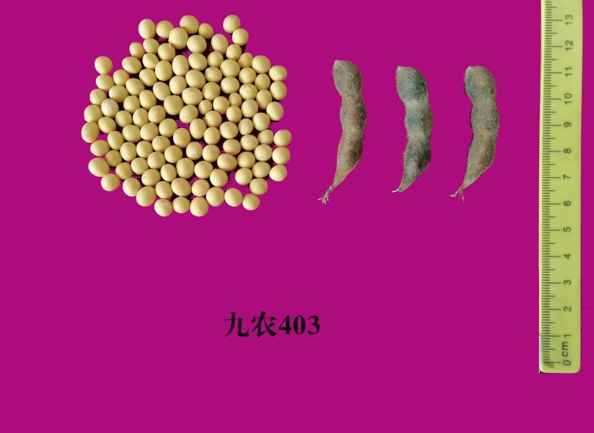 “九農403” (審定編號:吉審豆20210027)為高產大豆新品種。該品種以合豐51為父本,九農33為母本。2019年區域試驗平均公頃產量3137.40公斤,比對照吉育86增產15.04%;2020年區域試驗平均公頃產量3194.82公斤,比對照吉育86增產13.20%,二年區域試驗平均公頃產量3166.11公斤,比對照吉育86增產14.12%;2020年生產試驗平均公頃產量3171.79公斤,比對照吉育86增產12.18%。亞有限結莢習性,平均株高81.7厘米,主莖節數17.8個,有效分枝2.2個,三粒莢多,莢熟時呈褐色。尖葉、紫花、灰毛,籽粒圓形,種皮黃色,有光澤,種臍黃色,平均百粒重20.0克。人工接種鑒定,高抗大豆花葉病毒1號株系,高抗大豆花葉病毒3號株系。籽粒粗蛋白質含量38.81%,粗脂肪含量21.26%。