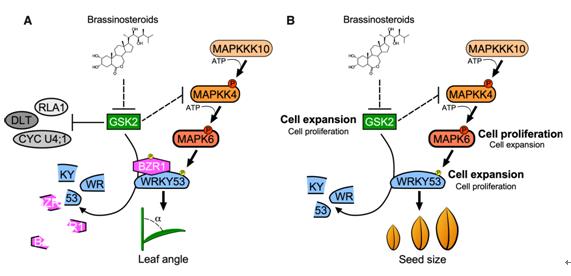 該團(tuán)隊(duì)在前期的工作中發(fā)現(xiàn),OsWRKY53正調(diào)控水稻粒型和葉傾角的大小,是水稻BR信號(hào)的正調(diào)控因子;OsMAPK6能夠磷酸化OsWRKY53,而且OsMAPK6對(duì)OsWRKY53的磷酸化能夠增強(qiáng)OsWRKY53的生物功能。在此基礎(chǔ)上,通過(guò)分析OsWRKY53與OsMAPKKK10-OsMAPKK4-OsMAPK6組分的雙突變體表型,在遺傳學(xué)上證明OsWRKY53是MAPK信號(hào)的底物,能夠參與調(diào)控水稻葉傾角和粒型。