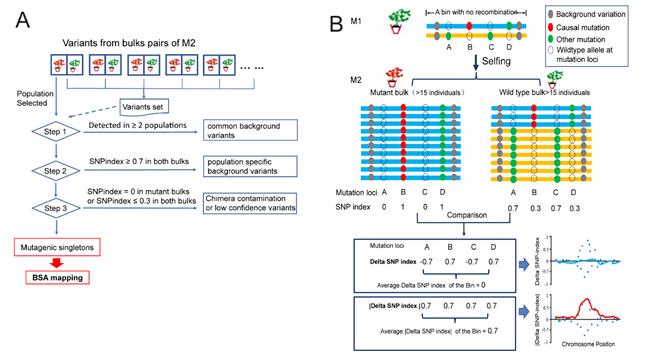 (A) 變異過濾過程概述。(B) 定位攜帶因果突變的基因組區(qū)域的原理圖。ΔSNP-index絕對值曲線(紅色曲線)用于識別因果突變區(qū)域。